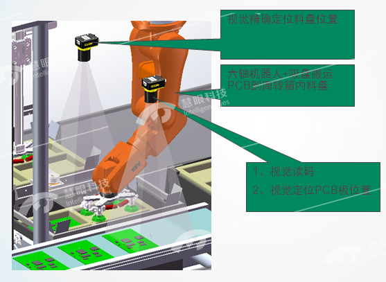 同时定位产品及纸箱每个料槽,达到精准定位抓取及放料装箱后自动贴标。
